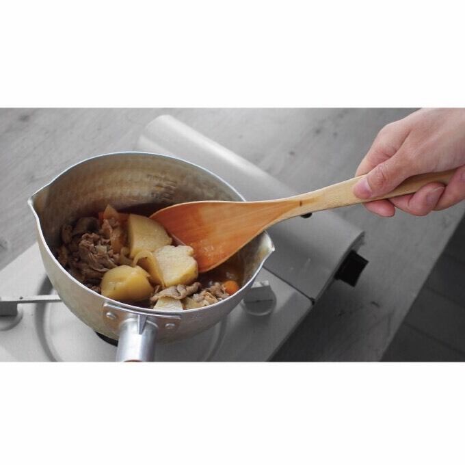 持ち手が浮いているので横に置いてもつかみやすく、竹なのでフライパンなどに傷がつきにくいです。